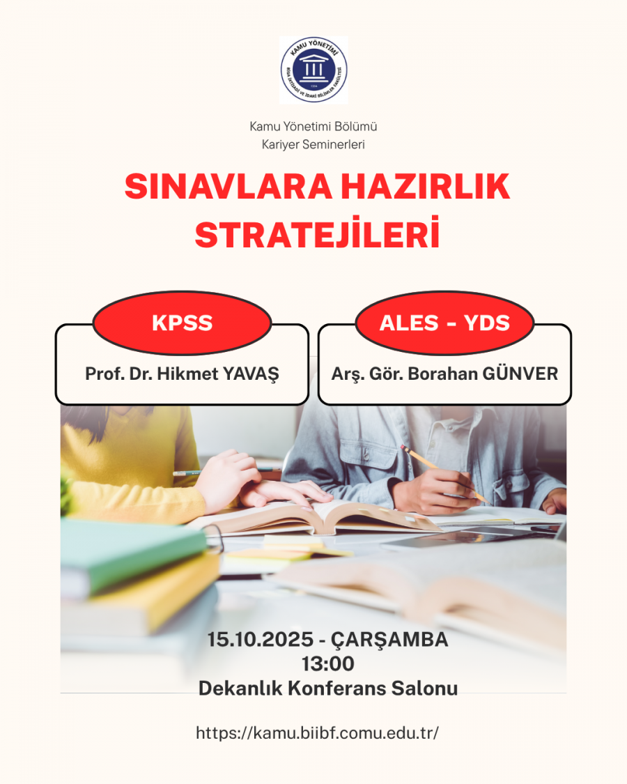 Sınavlara Hazırlık Stratejileri konulu seminer 15.10.2025 tarihinde saat 13:00'da Dekanlık Konferans Salonu'nda gerçekleştirilecektir.